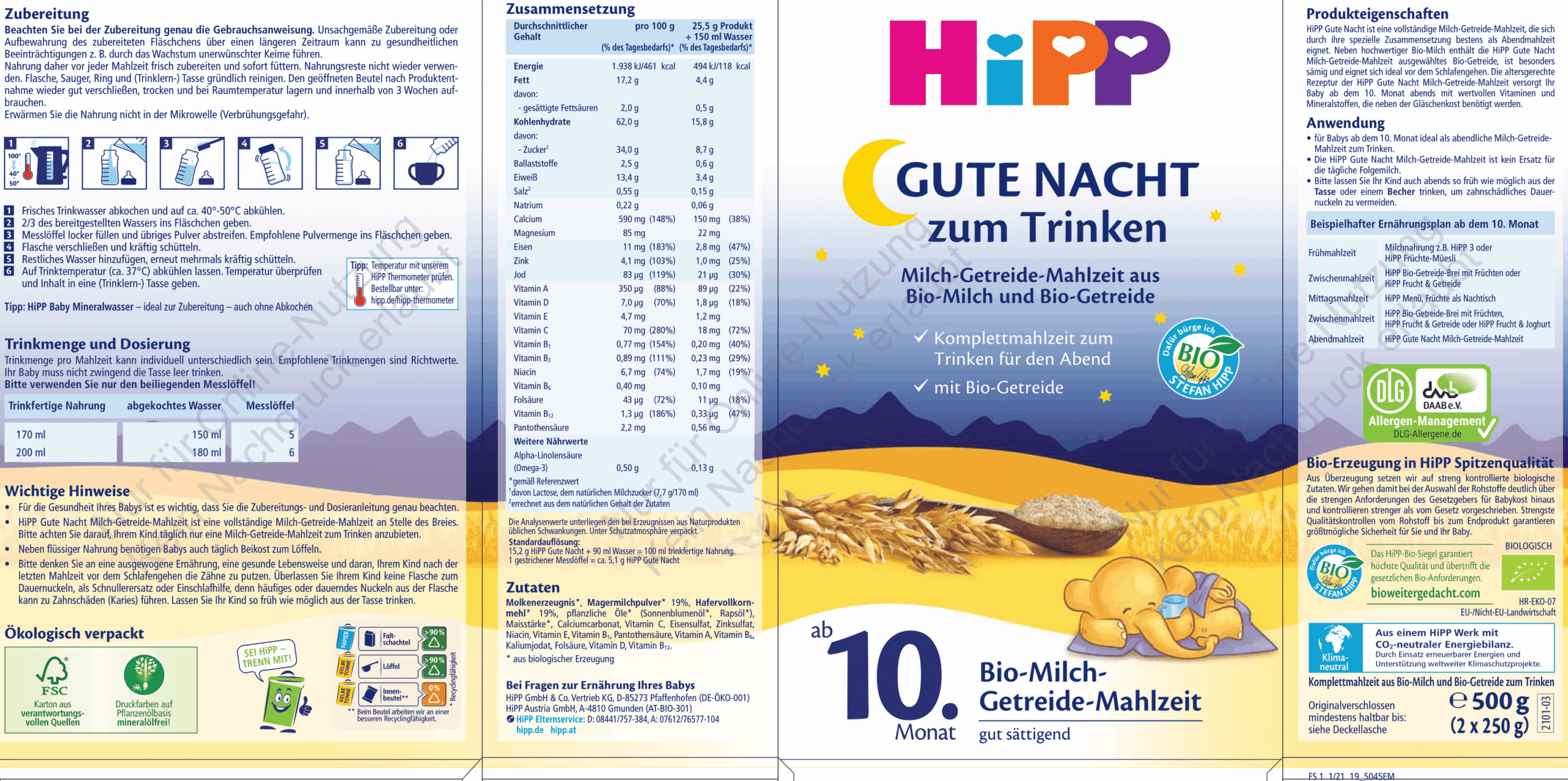 By using age-appropriate follow-on milk , the HiPP Good Night organic milk-cereal meal provides your baby with age-appropriate amounts of vitamins and minerals even in the evening