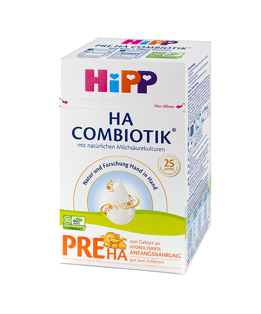 HiPP HA PRE undergoes a hydrolysis process where long-chain milk proteins are broken down into smaller fragments, removing casein from cow’s milk to reduce allergic reactions. The absence of starch creates a thinner consistency that resembles breast milk and is easier for young babies to digest.