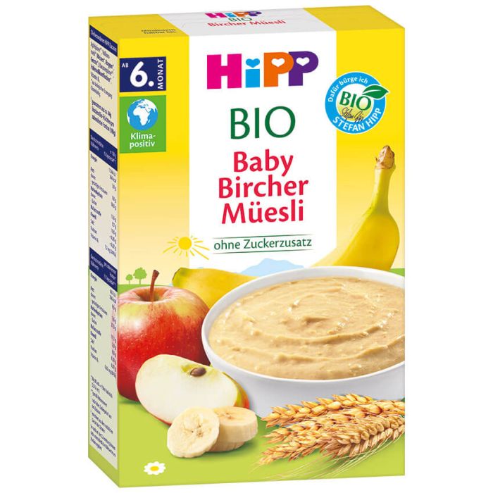 The Organic Baby Bircher Müesli by HiPP is made with whole grain cereals and delicious fruit. It contains no added sugar and is enriched with vitamin B1, an important nutrient. Suitable for preparing porridge in a variety of ways for babies 6 months old & up.