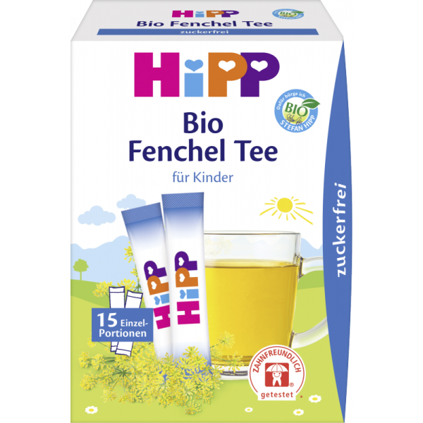 Hipp Organic Fennel Tea in the practical single pack. To supplement the liquid intake (e.g. in case of sweating) or as a thirst quencher as needed. Depending on the age of your child, 1-2 portions spread throughout the day.