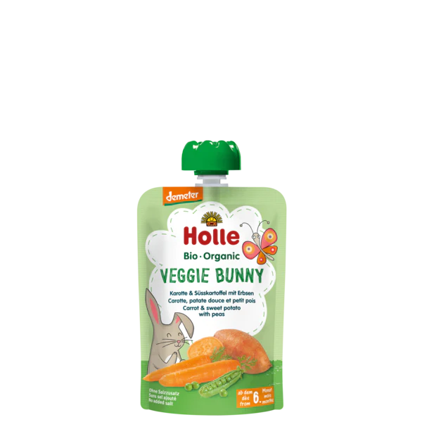 Holle’s biodynamic squeezable carrot, sweet potato and pea puree VEGGIE BUNNY is suitable for babies from 6 months of age. Without synthetic, artificial food additives. Without additional added sugar (the product contains natural sugars), naturally sweet from the vegetables themselves. Extra finely ground.